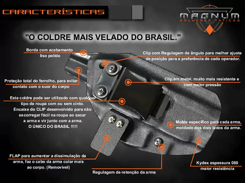 O coldre MAGNUM é a última palavra em coldre IWB (inside-waist-band). Ele combina velocidade, conforto, versatilidade, praticidade, confiabilidade, mobilidade, segurança e um alto grau de concealability (DISSIMULAÇÃO).